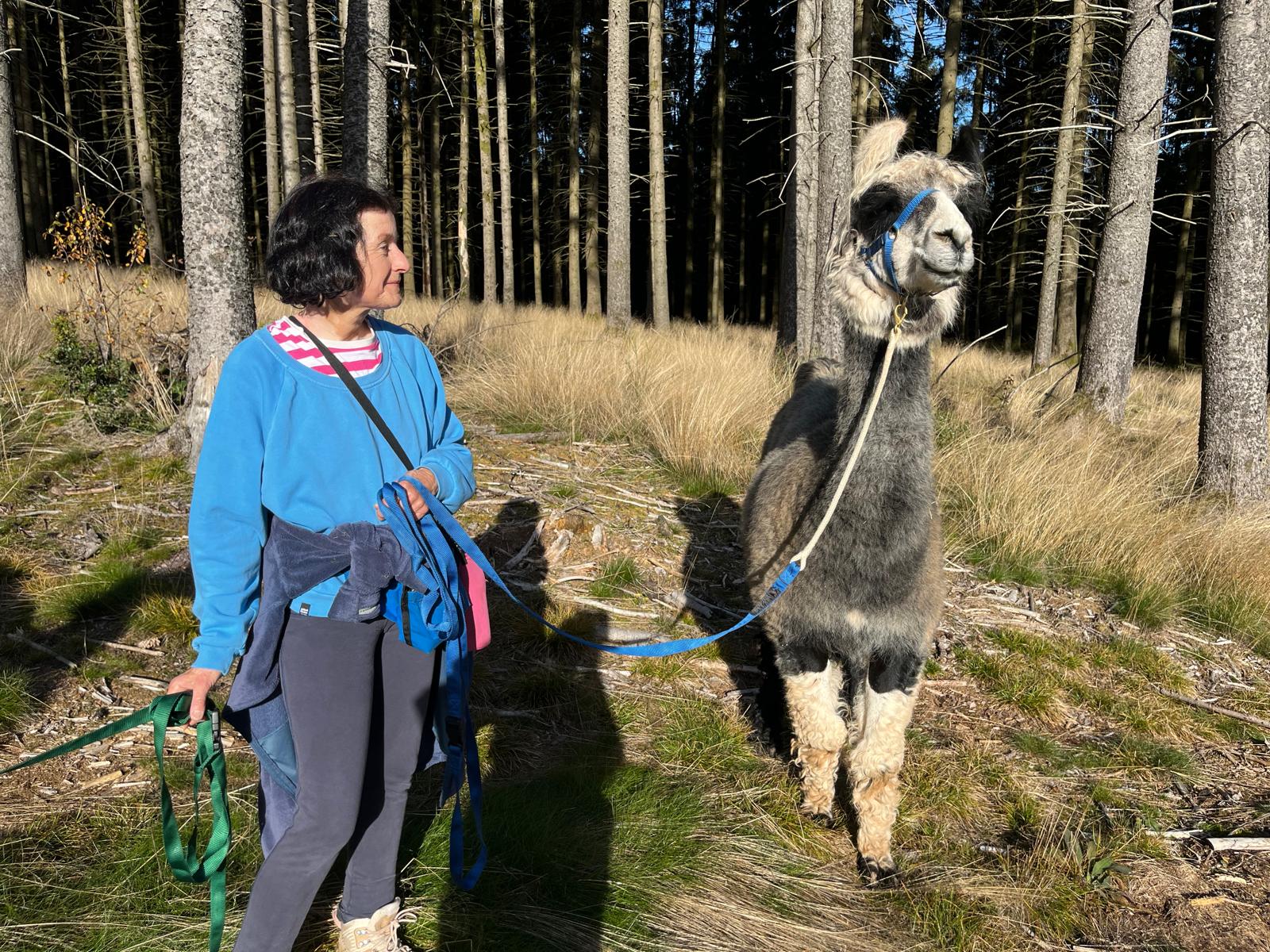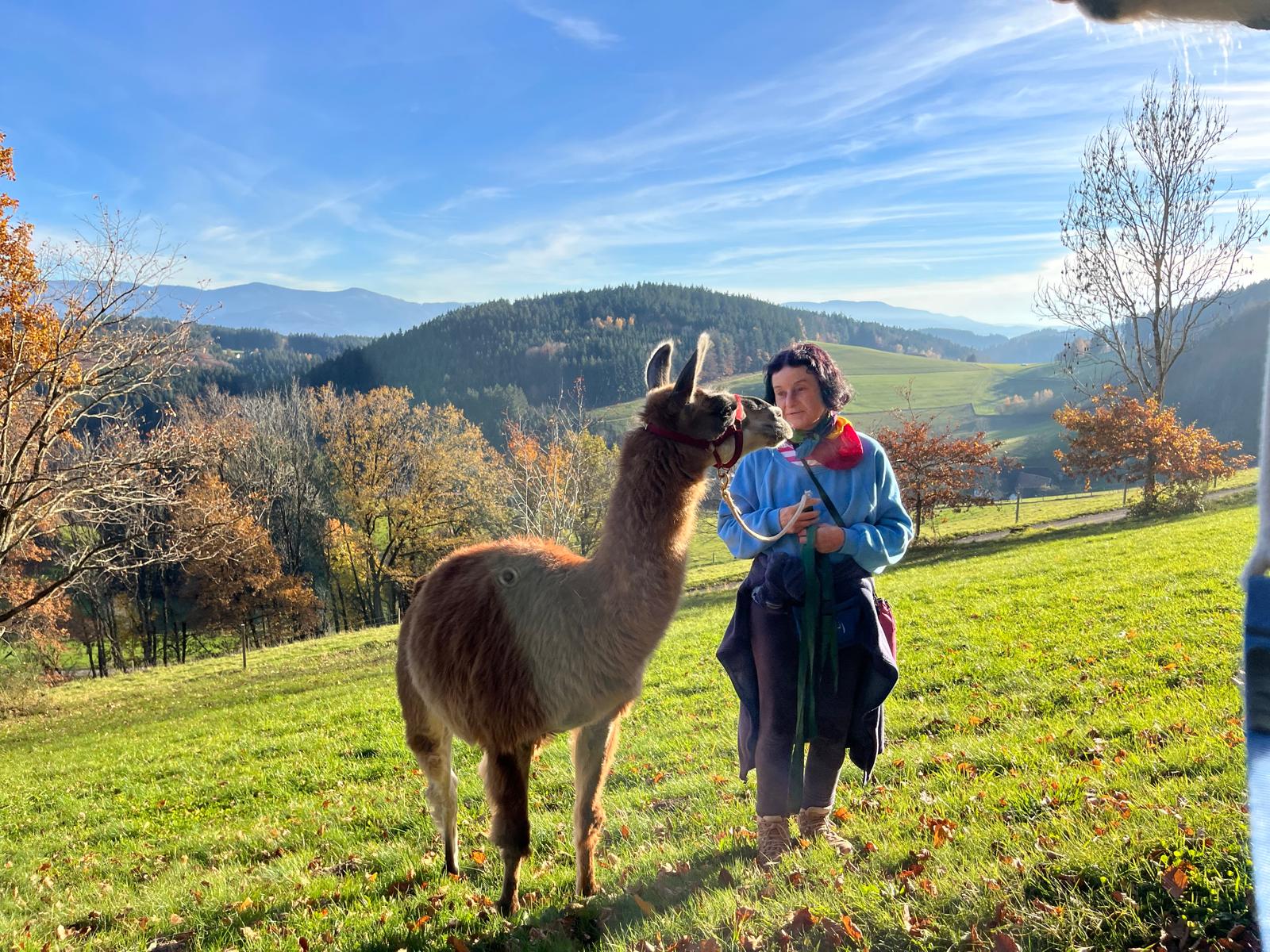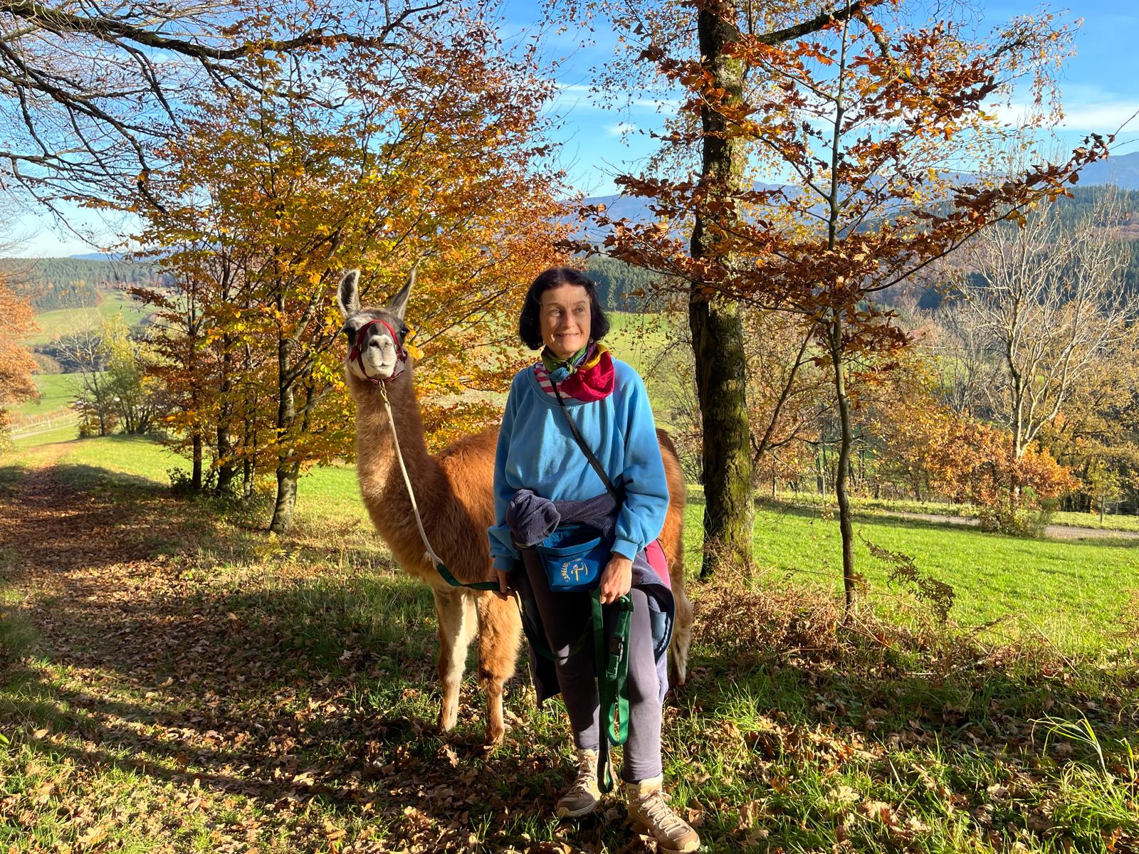Elisabeth Nieskens bietet sanftere Lama Wanderungen im Panorama der Alpen. Sie hat selbst einige Kurse in Camelidynamics und TEAM absolviert