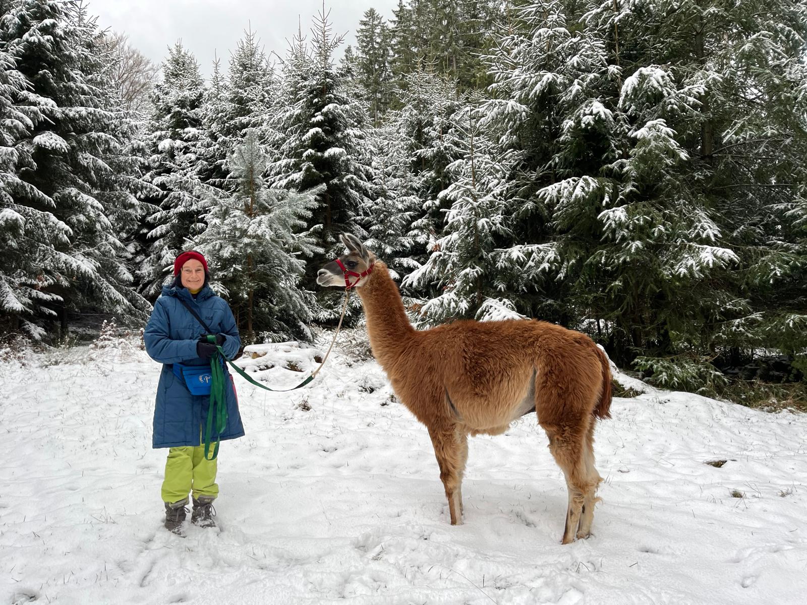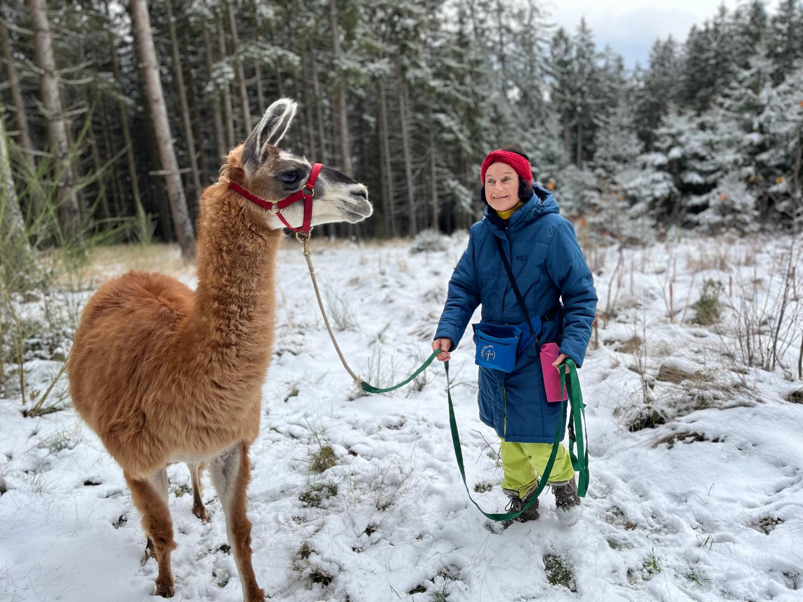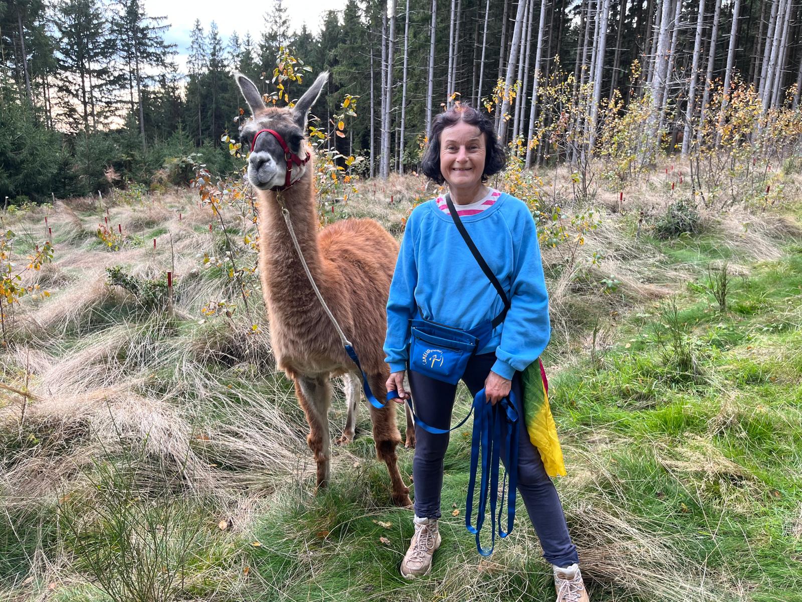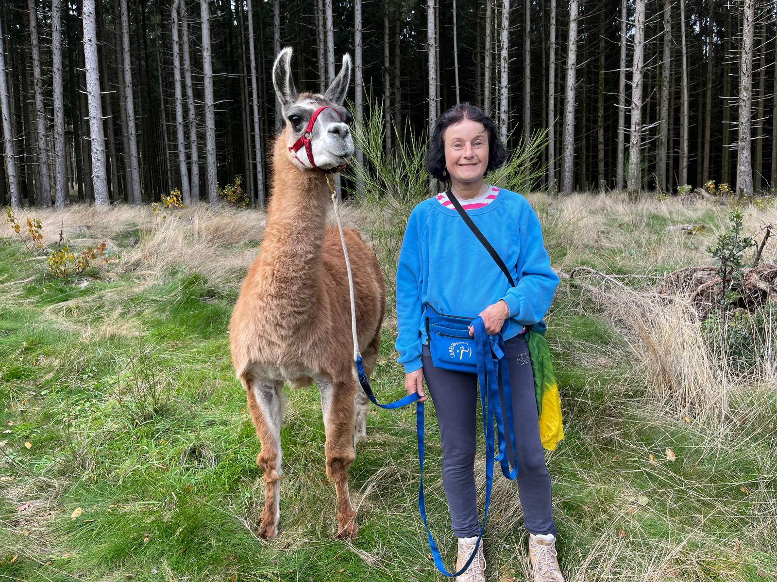 Elisabeth Nieskens bietet sanftere Lama Wanderungen im Panorama der Alpen. Sie hat selbst einige Kurse in Camelidynamics und TEAM absolviert