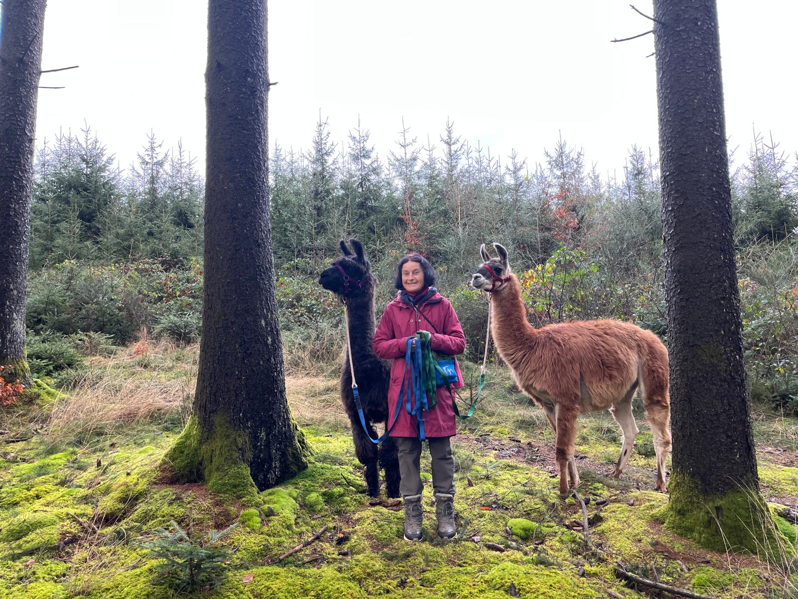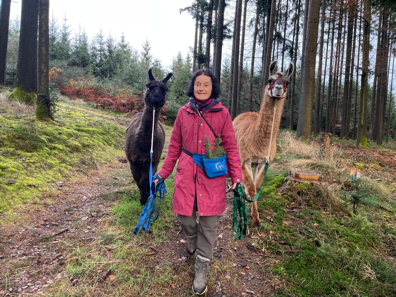 Eine Bekannte mit 3 Lama- Wander-stuten bei Reutlingen