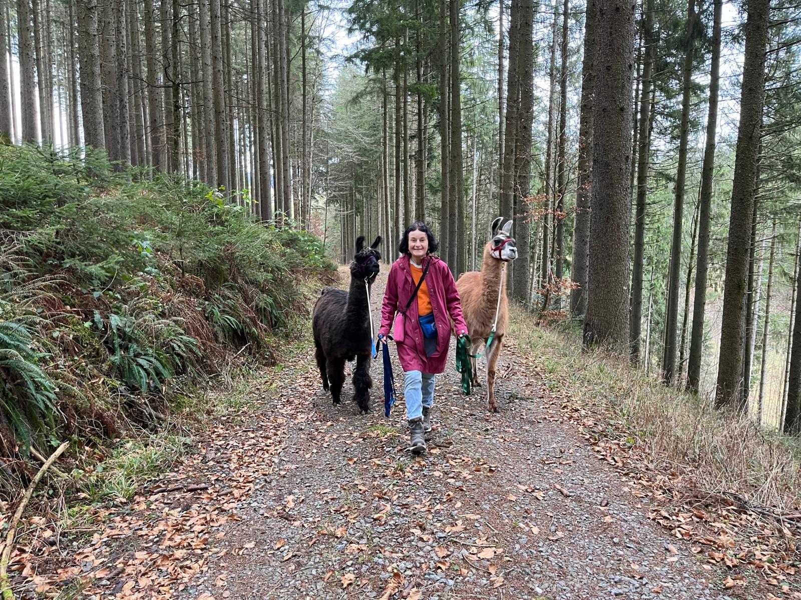 Eine Bekannte mit 3 Lama- Wander-stuten bei Reutlingen