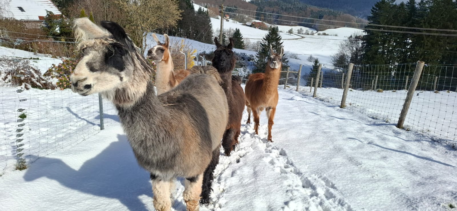 Nach 3 Wochen sind die neuen 3 Lamas ganz hier angekommen und die Stimmung am noch trennenden Zaun zwischen den 2 Gruppen ist entspannt. Ich bin froh dem Rat von Hubert Wendt gefolgt zu sein und sie so lange getrennt zu halten, so kann ich täglich in aller Ruhe Kontakt mit den 3 neuen Lamas aufnehmen- und unser Vertrauen bildet sich schnell.