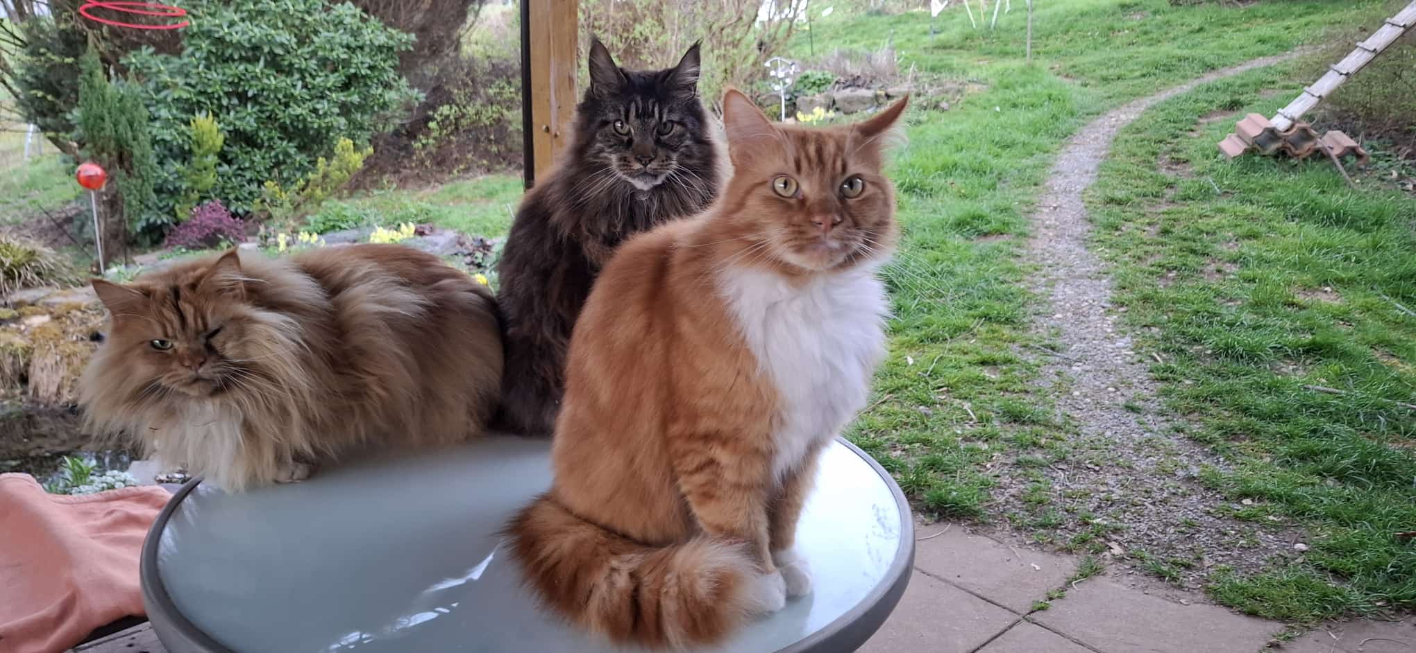 Katzen an Leine auszuführen ist sicher auch ok, nur man kann es halt nicht den ganz Tag lang machen, das ist für die Coonis oft zu selten, und sie sind ja besonders gernen nachts drausen. Mir war wichtig dass die Coonis ganz normal am Alltagsleben mit uns im Garten teilnehmen können und immer dabei sind. Klar Coonis sind sehr gute Jäger... das ist ein echter Nachteil hier und tote Beuttiere machen mich traurig , wobei ich hatte einen Kater den Brama, der immer nur Schmetterlinge gefangen hat und er hat nie eine Maus gegessen.